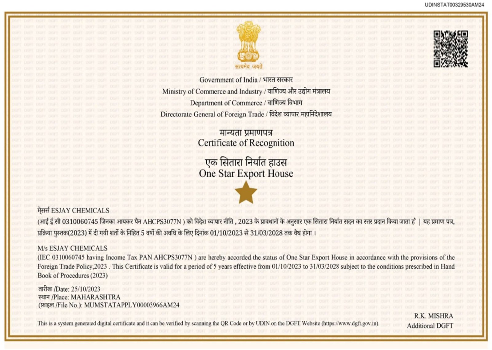 GSP Chem (Esjay Chemicals) has been awarded the status of a One Star Export House by the Directorate General of Foreign Trade (DGFT), Government of India.